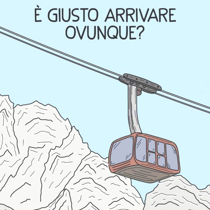 [Quest’immagine è tratta da un bellissimo post della pagina Instagram di divulgazione ambientale betula_stuff, dove lo potete leggere per intero – cliccate sulle immagini; qui trovate il loro sito web.]Molte volte, dietro certe infrastrutture turistiche quanto meno opinabili che vengono realizzate in montagna, viene posto un “pensiero” che poi regolarmente si manifesta in forma parecchio dogmatica quando si cerca di osservare la criticità delle opere: «la montagna è di tutti!». Per cui, via con le ciclovie larghe come strade che raggiungono luoghi alpestri incontaminati e spesso spianano sentieri storici o, viceversa, guai a invocare la chiusura di certi percorsi stradali o alpestri perché troppo affollati e per ciò degradati – e degradanti i luoghi che attraversano. «La montagna è di tutti!» ripetono i promotori di quelle opere, «tutti hanno il diritto di poterci andare e di godere delle sue bellezze!» Affermazioni che in realtà nascono ben altri fini – o ben altri affarismi, per meglio dire – le cui parole a loro volta “spianano” le montagne, la loro cultura, l’anima peculiare, in maniera oltre modo pericolosa perché basate sul principio del “si può fare tutto”. L’esperienza montana non conta più, nemmeno la fatica che dava valore alla meta raggiunta e tanto meno la relazione con i luoghi: bisogna arrivarci, punto. E farlo il più agevolmente possibile perché più persone possibili possano farlo. Allora spianiamole tutte queste montagne maledettamente ripide, accidentate, aspre! Chi siamo noi per poter dire che lassù ci si può arrivare solo se ben allenati dopo qualche ora di cammino o soltanto con un’adeguata tecnica ciclistica oppure alpinistica, oltre che con la dovuta consapevolezza del luogo e del contesto? «La montagna è di tutti, tutti ci devono poter salire!»