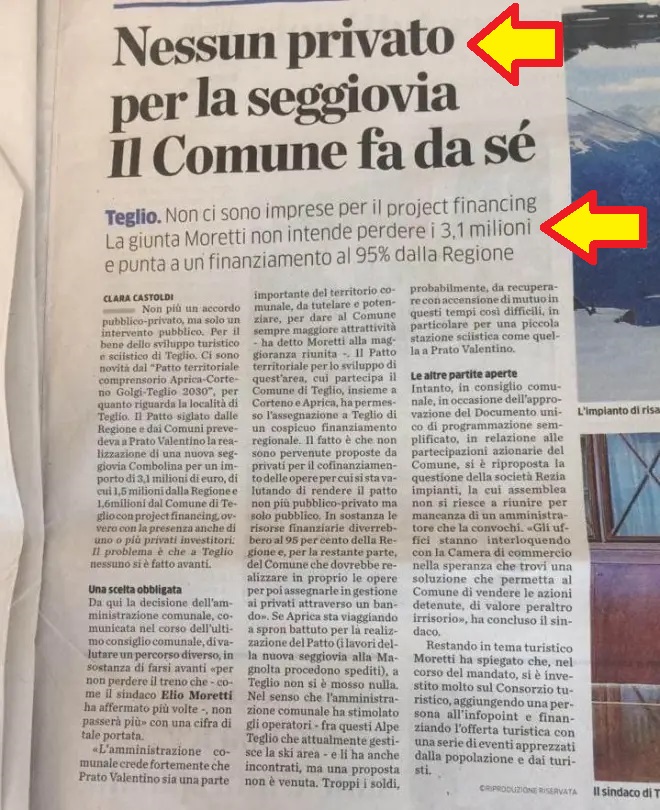 È una cosa semplicemente vergognosa, non c’è altro da dire. Semmai c’è solo da “combattere” per avversarla e non portarla a compimento, investendo invece tutti quei soldi nel progetto “Prato Valentino 2050” e/o in cose veramente proficue e lungimiranti per Teglio, le sue montagne e per la comunità locale. E lavorando pure per evitare che in futuro amministratori pubblici così scriteriati possano di nuovo pensare ad assurdità del genere, che ne dimostrano la totale alienazione verso i nostri territori montani. Che quelli dovrebbero ben governare, non così assurdamente svendere e degradare.