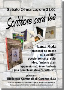 Sabato 24 Marzo, alle ore 21.00, sarò ospite della Biblioteca Comunale di Carenno (Lecco) per una serata intitolata Scrittore sarà lei!, nella quale presenterò me stesso e i miei libri, dagli inizi fino all’ultimo Cercasi la mia ragazza disperatamente, oltre che le mie idee, lo stile, le fantasie, le follie e molto altro… Ci sarà da divertirsi e ci sarà anche qualche sorpresa, ve lo garantisco! E ci sarà pure, a fine serata, un piccolo rinfresco offerto dalla Biblioteca.