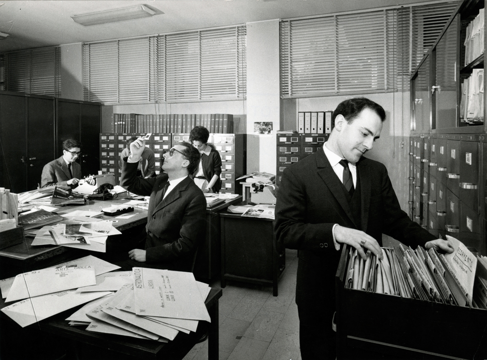 Questa immagine ritrae giornalisti e fotografi nell’archivio fotografico della Mondadori a Milano, nel 1961. (Angelo Cozzi, Mondadori Portfolio – immagine tratta da internazionale.it)
