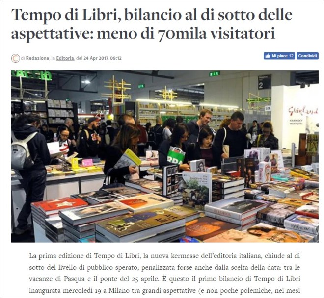 Io, che ci ho lavorato un po’ e l’ho vissuta da dentro, (anche se non me ne intendo di marketing e la penso easy) posso garantirti che non è stata vissuta minimamente come una possibile “minaccia” alla fiera del libro di Torino. Erano due contesti diversi, nessuno, credo, può aver desiderato anche soltanto offuscare la storica fiera del libro.