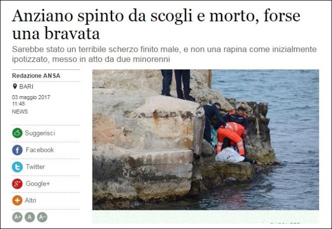 Essendo particolarmente sensibile alla percezione del livello di senso civico diffuso, non posso non unirmi al coro di chi protesta per come la notizia sottostante venga presentata da molti media: un efferato assassinio spacciato per “bravata” solo perché commesso da due minorenni. Evidentemente, il degrado culturale che sta soffocando la nostra società è probabilmente più grande di quanto pensiamo, con bieca delizia dei media che su ciò ci marciano sopra con il loro ormai cronico e qualunquistico clickbait per il quale nemmeno conta più la tragedia della morte, a quanto si direbbe – tragedia sempre più sdoganata verso il solito morboso sensazionalismo da reality televisivo. E se tale situazione non migliora, in fondo è perché noi tutti, che di quella società siamo parte – ovvero che quella società siamo, per fortuna o purtroppo – non facciamo abbastanza per evitarle l’abisso finale, anzi, sovente contribuiamo ad accelerare la corsa verso l’orlo. A partire dal considerare un fatto come quello in questione – ribadisco – un assassinio frutto di una barbarie culturale, sociale, civica, etica da combattere e debellare con fermezza e rapidità, e non una “bravata”, uno “scherzo finito male”, una cosa tutto sommato banale e ignorabile. La sostanziale accettazione della malvagità, in pratica, ovvero la normalizzazione della barbarie nella società civile. “Civile” dove, poi?
