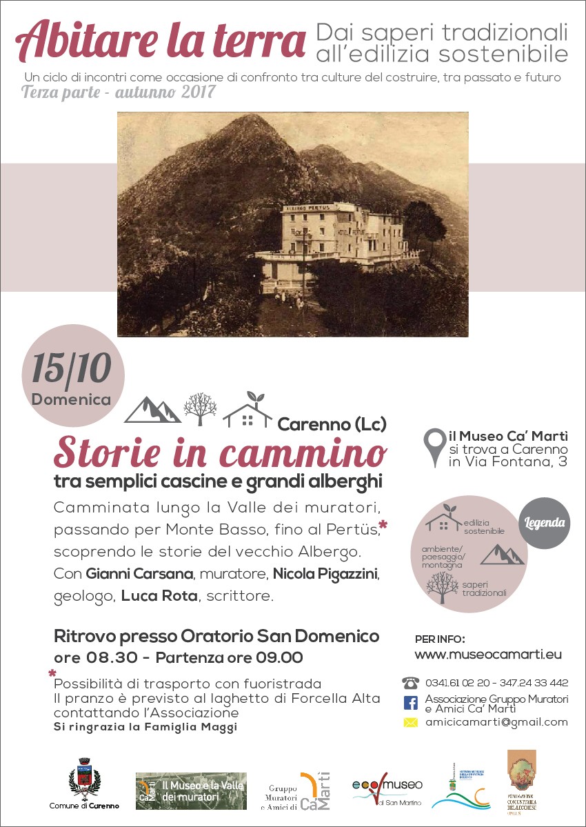 Nell’ambito della rassegna Abitare la terra. Dai saperi tradizionali all’edilizia sostenibile, il Museo Ca’ Martì di Carenno organizza per domenica 15 ottobre Storie in cammino tra semplici cascine e grandi alberghi, una camminata lungo l’itinerario ecomuseale della Valle dei Muratori fino all’ex Grande Albergo del Pertüs, attraverso paesaggi di grande bellezza e luoghi dal forte fascino storico e culturale che la montagna carennese e la dorsale dell’Albenza sanno offrire.