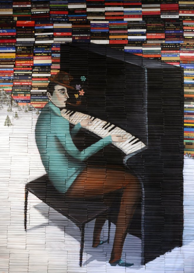 Mike Stilkey è un artista americano che, tra le altre cose, crea delle bellissime sculture di libri. In pratica, combinando copertine e dorsi, crea dei veri e propri “quadri”, spesso di grandi dimensioni ed estremamente suggestivi, come quelli che ha realizzato nel marzo di quest’anno presso la Starfield Library di Seoul – biblioteca della quale vi ho parlato qui.
