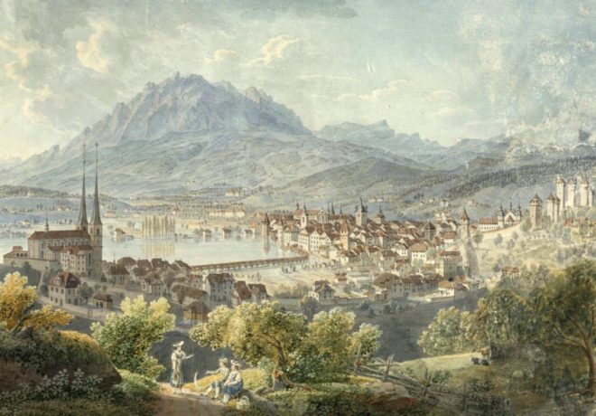 Nei resoconti di viaggio del XVIII secolo, Lucerna viene descritta come una cittadina triste, antiquata, repressiva e arretrata. Arthur Schopenhauer lo ha espresso in modo sintetico: “Una piccola città deserta e mal costruita. Ma la vista è divina”. Perché questo è ciò che Lucerna aveva da offrire: la vista. Ci sono poche città da cui si può guardare direttamente a sud, attraverso un lago, verso le montagne coperte di neve quasi tutto l’anno. Lo si può fare a Ginevra, lo si può fare a Montreux e proprio qui a Lucerna. E questo lago corrispondeva particolarmente bene allo sguardo romantico sviluppatosi nel XIX secolo.