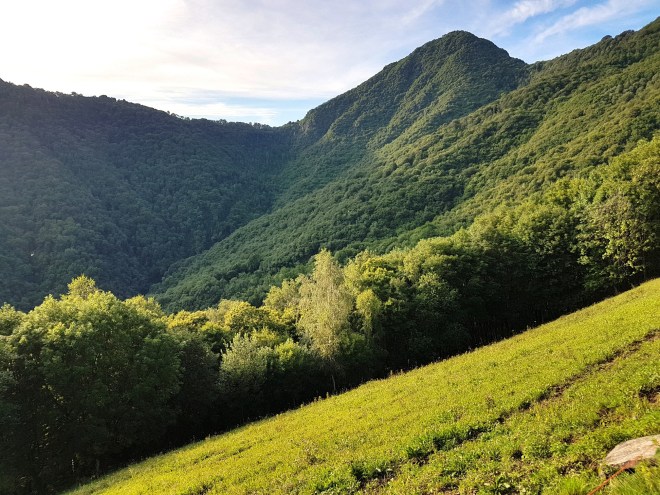 Come qualche sera fa, sui monti sopra casa, con la particolare luce via via più radente che anticipa il tramonto del Sole e la nitidezza d’un cielo pulito quanto basta da una tranquilla brezza, respirando la leggera e delicata aria vespertina che dopo una giornata di lavoro è uno dei balsami più rigeneranti e, a sua volta, fa da impulso di leggiadra energia a vivificare e accendere la percezione dei sensi. Ho osservato il paesaggio “ordinario” dacché domestico, quello dell’immagine in testa al post, un angolo di territorio conosciuto in ogni sua parte ma senza che ciò possa mai mitigare la curiosità nella sua visione, nella scoperta di qualcosa di inopinato, e così ho esclamato dentro di me «to’, ma guarda che roba!»: