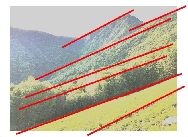 Geometrie eterne nella geografia quotidiana (cerco di riprodurle dozzinalmente nell’immagine qui sopra) che si svelano d’improvviso come nuove, mai viste o mai colte, dissolvendo il tempo nell’istante di quel presente e disegnando lo spazio con linee inedite, non più ignote ma comunque fascinosamente arcane, che evolvono e impreziosiscono il paesaggio percepito di nuove impressioni, cognizioni, immaginazioni. Tutto ciò come mai prima avevo visto e come mai dopo vedrò: le altre volte erano diverse geometrie, impressioni, percezioni, le prossime saranno ulteriori proporzioni, armonie, simmetrie. Con tutto questo, nemmeno io resto quello di ieri e non sarò domani ciò che sono oggi: le geometrie armoniche del paesaggio, variabili, multiformi, caleidoscopiche, ri-conformano ogni volta anche il mio paesaggio interiore, così che quelle armonie siano anche le mie e io sia in armonia con il territorio e il paesaggio che le generano.