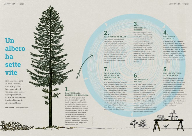 L’economia circolare del legno è ottimamente rappresentata dall’infografica in testa al post tratta dall’ultimo numero – il 107 – di “Alpinscena”, la rivista della CIPRA, che spiega in modo tanto chiaro quanto suggestivo perché gli alberi siano per noi tutti creature a dir poco fondamentali – persino a prescindere dalla fotosintesi clorofilliana. Cliccate sull’immagine per leggerla in un formato “poster” più grande nonché ben stampabile, e non dimenticate di manifestare tutta la vostra deferenza e affabilità agli alberi che vi capita di incontrare!