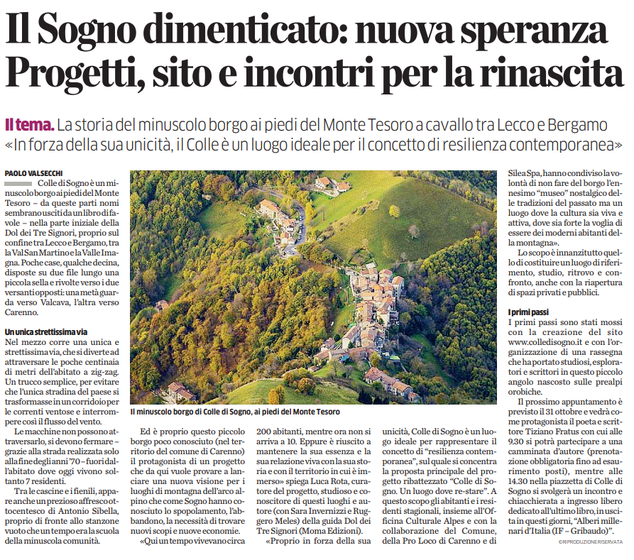 Ringrazio di cuore Paolo Valsecchi, autore dell’articolo e cronista sempre attento e sensibile, per aver ben raccontato quanto stiamo facendo a Colle di Sogno cogliendo lo spirito e la visione del progetto, oltre che per essere stato presente a Colle, domenica 17 in occasione dell’incontro con lo scrittore ed esploratore Franco Michieli, così potendo constatare di persona la qualità degli appuntamenti proposti nella rassegna.