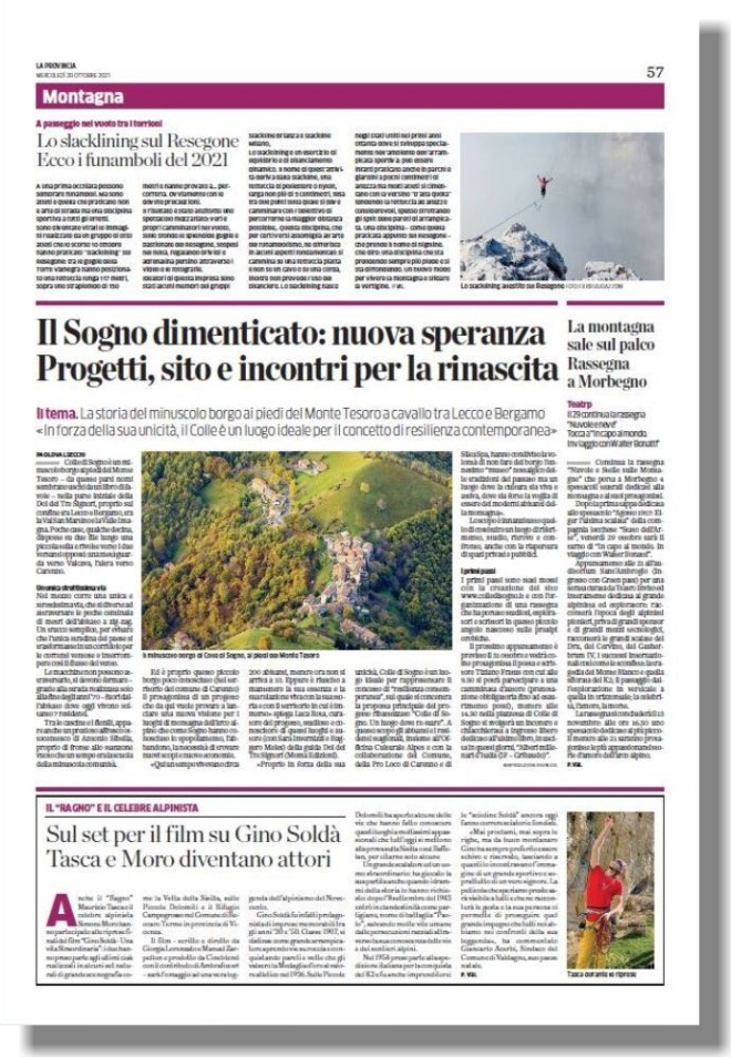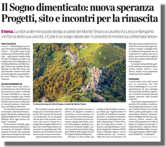 Mercoledì 20 ottobre scorso, sulla pagina del quotidiano “La Provincia” dedicata alla montagna, è uscito un ottimo e completo articolo su Colle di Sogno, sul progetto Un luogo dove re-stare che sto curando con l’Officina Culturale Alpes per il Comune di Carenno e con la collaborazione della locale Pro Loco, e sulla rassegna di eventi che nell’ambito del progetto stanno animando le domeniche di ottobre del sublime borgo prealpino. La pagina la vedete lì sopra e l’articolo nello specifico qui sotto – cliccate sopra ad entrambe le immagini per ingrandirle.