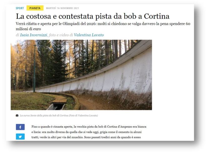 Il comitato organizzatore ha inserito la pista nel programma ufficiale: qui, secondo le previsioni, si terranno le gare di bob, di slittino, di skeleton e forse anche di parabob, durante le paralimpiadi. Prima, però, la pista va ristrutturata. È un cantiere complesso e costoso, da oltre 60 milioni di euro, con conseguenze rilevanti per un ambiente particolarmente delicato come la montagna. Molte persone a Cortina si stanno chiedendo se ne valga davvero la pena.