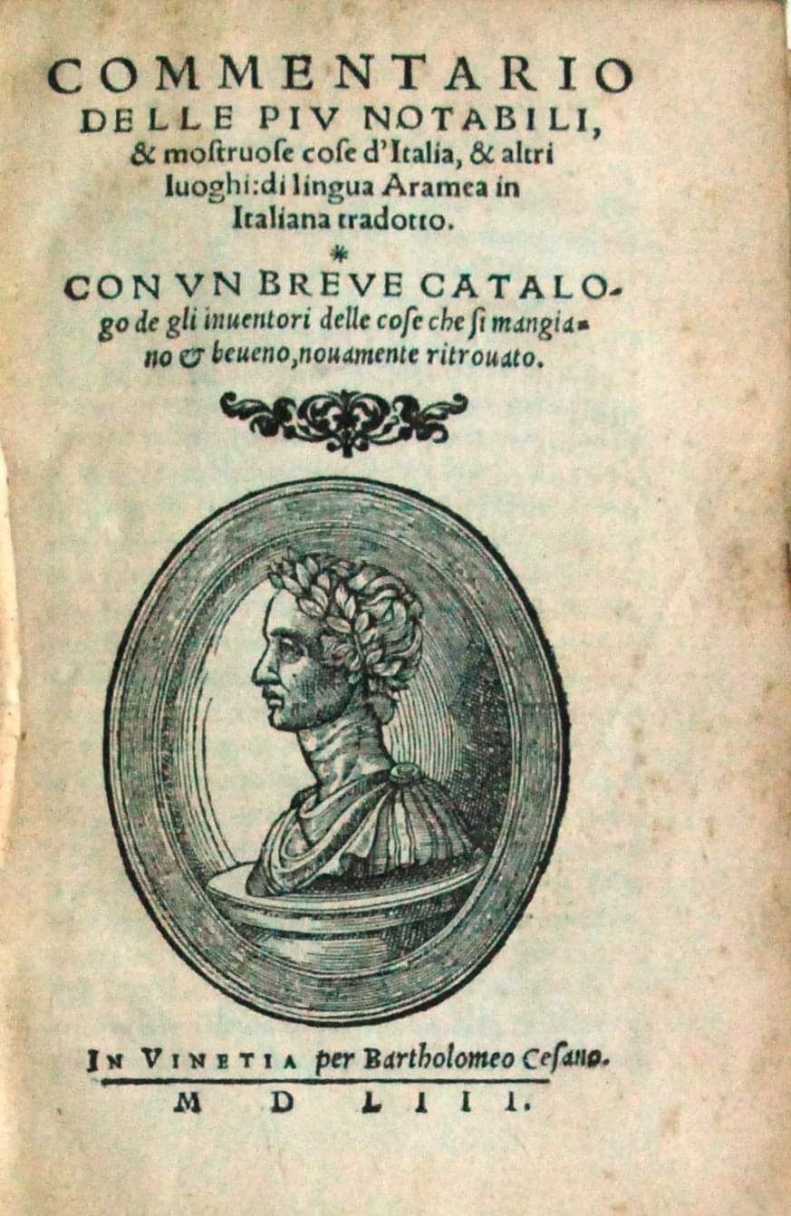 (Ortensio Lando, Commentario de le più notabili, & mostruose cose d’Italia, & altri luoghi, di lingua aramea in italiana tradotto, nelquale s’impara, & prendesi estremo piacere. Vi si e poi aggionto un breue catalogo de gli inuentori de le cose che si mangiano, & si beuono, nuouamente ritrouato, & da messer anonymo di Vtopia composto, Vinetia, al segno del Pozzo, Andrea Arrivabene, 1550.)