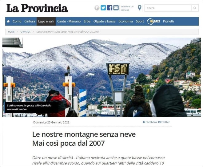 A novembre non volevo fare l’uccello del malaugurio e dunque non ne parlavo pubblicamente ma tra me pensavo, un po’ sarcasticamente e un po’ tristemente (comunque senza facile ironia, che non è proprio il caso): l’anno scorso, con impianti e piste chiuse causa Covid, in montagna c’era un sacco di neve; sta a vedere che quest’anno, con impianti e piste aperti, di neve ne verrà pochissima.