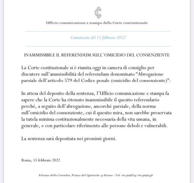 Secondo me – e ribadisco, secondo mela sentenza di inammissibilità della Corte Costituzionale circa il referendum sull’eutanasia è sorprendente, In pratica, e restando comunque in attesa delle motivazioni ufficiali, viene da pensare che la Corte non ammette la possibilità dell’individuo di decidere liberamente sul “fine vita” con una decisione che nel suo semplicismo stabilisce un’eutanasia giuridica della manifestazione di umanità (aggettivo) che l’individuo di una società culturalmente progredita ha il dovere di manifestare, per rivendicare il diritto di difendersi da sofferenze inumane e scegliere liberamente come crede della propria vita. Una sentenza sorprendente perché assolutamente ambigua, nel principio.