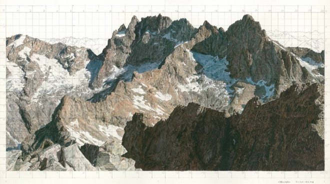 Come si legge nella presentazione della mostra, «Muovendo dal fascino per le cartografie alpine e le rilevazioni scientifiche realizzate nella seconda metà dell’Ottocento da Eugene Viollet-Le-Duc, Viano ha elaborato una ricerca del tutto personale, in cui i riferimenti al metodo architettonico si fondono con la ritrattistica di paesaggio. La specificità del suo lavoro risiede tuttavia nel metodo: Viano “fotografa” la montagna, e la materia minerale di cui è fatta, rappresentandola mediante una tecnica di carattere iperrealistico. Il dato fotografico è punto di partenza e guida affidabile per una ricerca sulla forma, mediante la quale Viano dà vita a un processo di conoscenza minuzioso del paesaggio. I dipinti prendono vita su carta da acquerello, supporto sul quale Viano riproduce la grammatica della carta millimetrata, che diventa elemento tecnico al contempo strumentale e strutturale per le rappresentazioni di montagne, ghiacciai e materia minerale.»