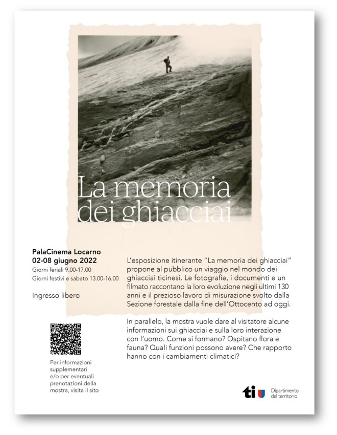 A proposito di ghiacciai (clic), loro storia e loro futuro – un tema oltre modo emblematico e fondamentale riguardo a ciò che ci aspetta nei prossimi anni – c’è una bella (e breve) mostra in corso a Locarno: ne vedete qui sopra la locandina (e cliccate sull’immagine per scaricarla in pdf); per saperne di più, date un occhio qui e qui.