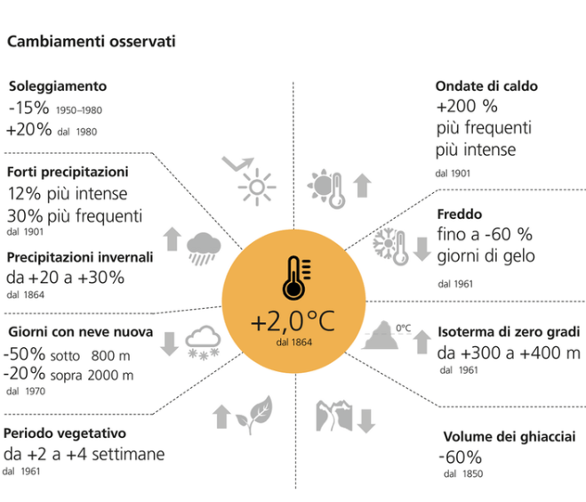 Sì, nel senso di fornire dati numerici chiari, semplici e incontrovertibili sui cambiamenti climatici in corso. Lo fa con ottime capacità di sintesi l’infografica qui sopra, elaborata dall’UFAM – Ufficio federale dell’Ambiente della Confederazione Elvetica (che ho ricavato da qui), le cui pagine istituzionali offrono numerosi altri dati e documenti, estremamente interessanti, sul tema.