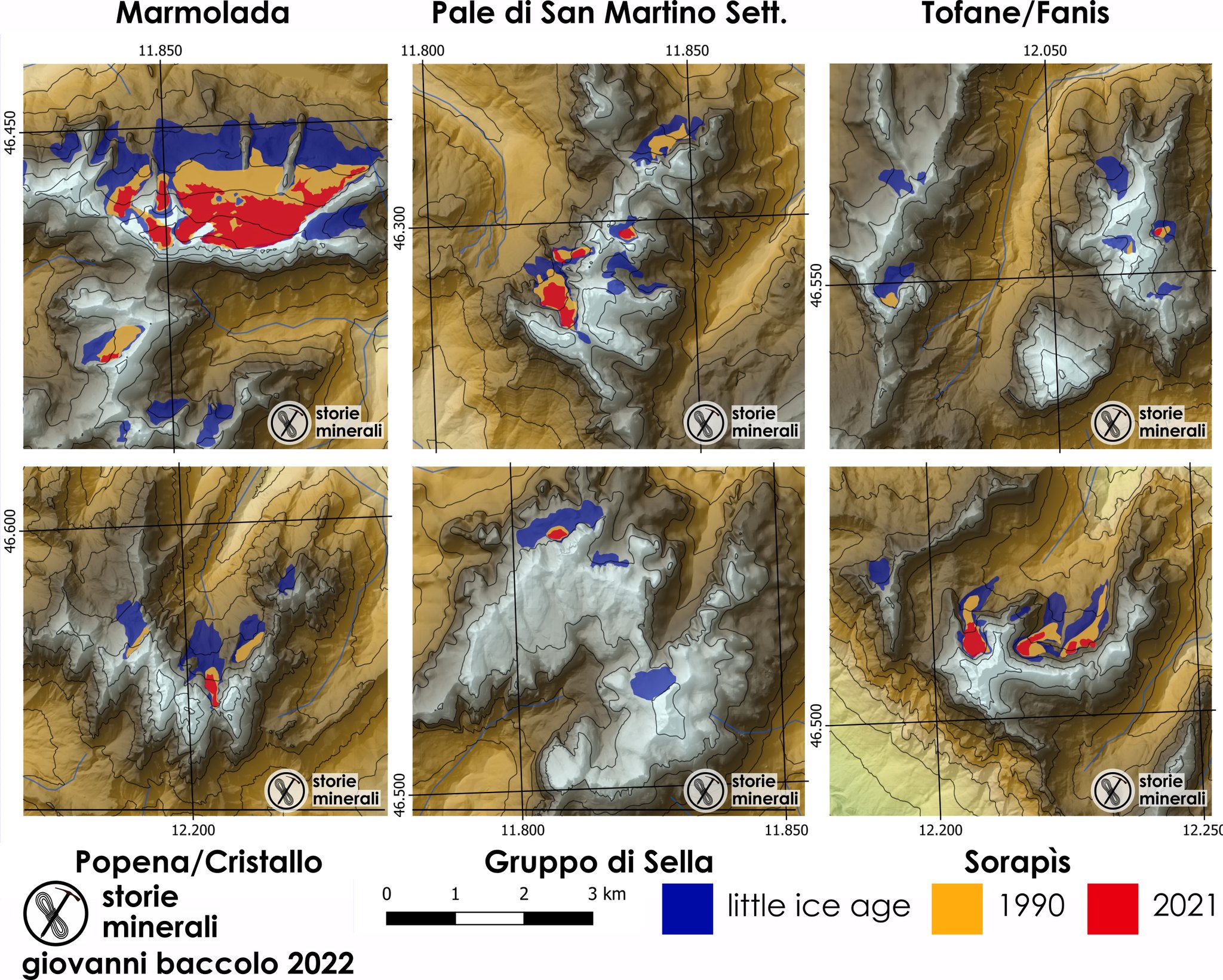 Sto raccogliendo da tempo materiale su questi ghiacciai, carte, fotografie storiche. Grazie a essi e allo studio delle fotografie aeree (i ghiacciai lasciano sempre dei segni nel paesaggio), sto elaborando una prima carta che mostri l’estensione di tutti i ghiacciai delle Dolomiti al termine della Piccola Età Glaciale (intorno al 1860), nel 1990 e nel 2021.