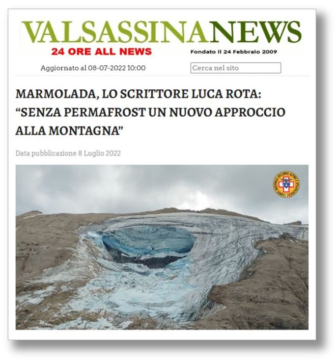 Oggi, su “Valsassina News” è uscita una mia riflessione su quanto accaduto in Marmolada domenica scorsa e, in generale, su come potrà (e dovrà) cambiare la nostra relazione con le montagne nel prossimo futuro in forza della realtà climatica e ambientale che ci aspetta; per leggere l’articolo cliccate sull’immagine qui sopra. Ringrazio molto la redazione per avermi sollecitato tale riflessione e per averla ritenuta così interessante da poter essere pubblicata.