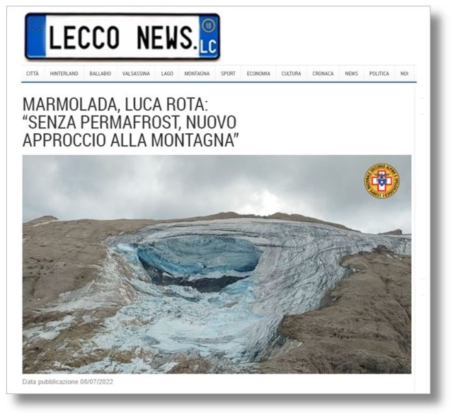 Anche “Lecco News” riprende le mie riflessioni su quanto accaduto in Marmolada e in generale su ciò che sta avvenendo sulle nostre montagne in forza della “nuova” e senza dubbio delicata realtà climatica che stiamo cominciando ad affrontare; per leggere l’articolo cliccate sull’immagine qui sopra.