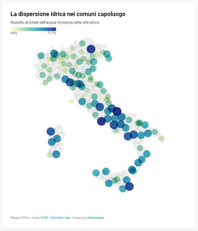Cliccando sull’immagine in testa al post aprirete la versione interattiva e potrete verificare i dati di dispersione idrica di tutte le città capoluogo di provincia italiane (l’infografica l’ho inizialmente trovata qui.)