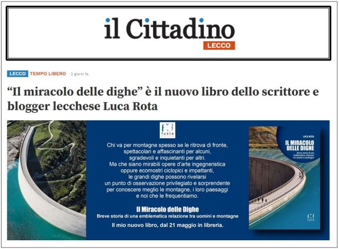 Ringrazio molto la redazione de “Il Cittadino” che già sabato scorso ha dato notizia dell’uscita (fate clic sull’immagine qui sopra) del mio nuovo libro Il miracolo delle dighe. Breve storia di una emblematica relazione tra uomini e montagne, pubblicato da Fusta Editore e disponibile dal 18 maggio ma che da qualche giorno si può prenotare in libreria o nei bookshop on line. La prima uscita “pubblica” del libro sarà invece al Salone del Libro di Torino domenica alle ore 15 presso lo stand di Fusta (B59, padiglione 1).