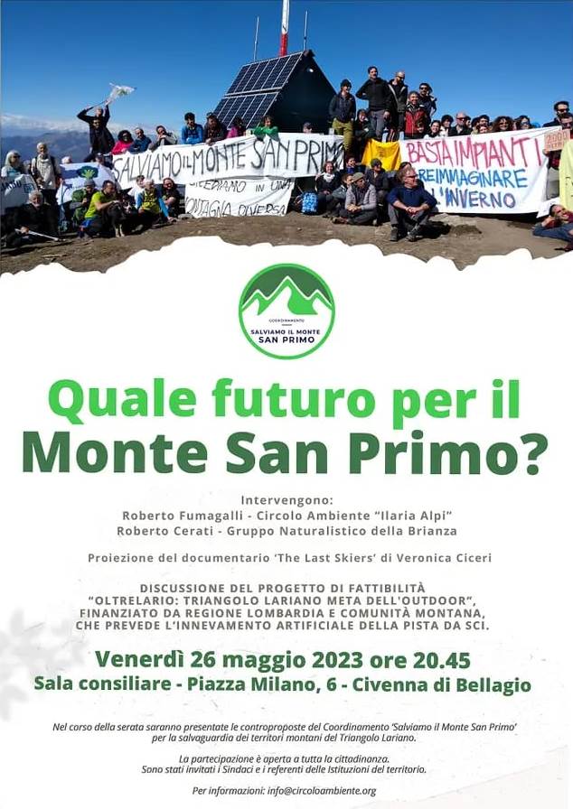 L’attività di sensibilizzazione pubblica riguardo il – famigerato – “Progetto di sviluppo turistico” che si vorrebbe imporre al Monte San Primo, portata avanti in primis dal Coordinamento “Salviamo il Monte San Primo”, continua con impegno incessante e d’altro canto assolutamente necessario, visto purtroppo il permanente rifiuto di un confronto da parte delle istituzioni coinvolte che ormai è sempre più la prova provata della loro malafede e dell’atteggiamento irrispettoso verso il San Primo e chi lo vuole vivere e godere in modo equilibrato.