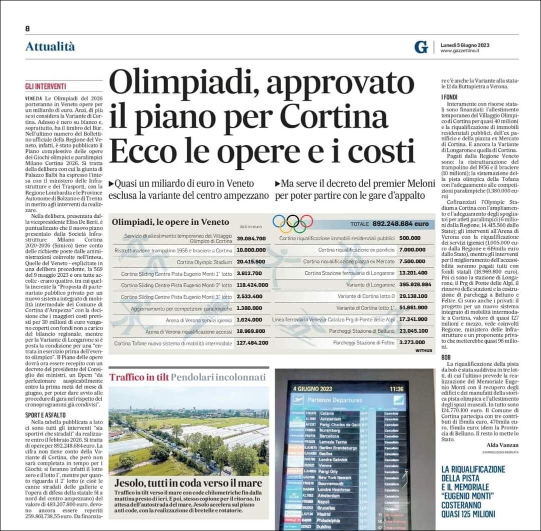 Un progetto che inizialmente era stimato in 60 milioni di Euro, ora è preventivato a oltre 120 milioni di Euro e chissà quanto ancora aumenterà. Da spendere per cosa? Un nuovo ospedale? Scuole, centri culturali, infrastrutture e servizi a favore della comunità? No, per la nuova pista di bob olimpica di Cortina. E non è che uno, e nemmeno il più sconcertante, dei tanti emblematici esempi del modo con il quale si stanno organizzando i giochi olimpici di Milano-Cortina 2026 e di vi si vogliono spendere più di cinque miliardi (!) di soldi pubblici.
