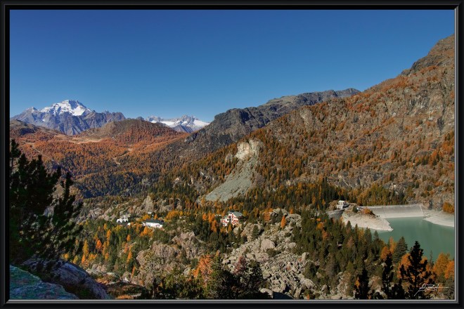 La piccola diga di Campo Moro (Lanzada, SO) con a fianco il Rifugio Zoia e i suoi scuri rossi, nel mio contesto preferito: l’autunno. Un luogo al quale sono molto legato perché attraversata più e più volte nel corso della mia infanzia e adolescenza per seguire i passi di mio padre verso il Rifugio Carate, la “Marinelli”, la “Marco e Rosa”, e poi ancora verso le più alte montagne della Valmalenco. Sullo sfondo i piani dell’Alpe Palù e, dentro al cielo, il magnifico Monte Disgrazia (3.678 m).
