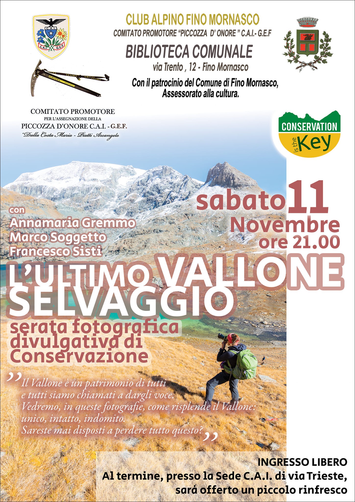 Dunque non mi resta che invitarvi caldamente – se siete della zona o vi potete giungere – alla serata di sabato 11 a Fino Mornasco con Annamaria Gremmo, Marco Soggetto e Francesco Sisti. Trovate le informazioni necessarie nella locandina qui riprodotta. Ve ne tornerete a casa con tanta bellezza nella mente, meraviglia nel cuore e molta più consapevolezza nell’animo riguardo le nostre montagne e non solo quelle. Ve lo assicuro.