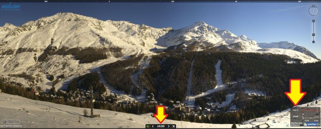 Madesimo, Valle Spluga (provincia di Sondrio): fermo immagine alle ore 14.00 di oggi, 19 dicembre, della webcam panoramica posizionata nei pressi della località Mottaccio degli Andossi, quota 1730 m. Cliccateci sopra per ingrandirla.