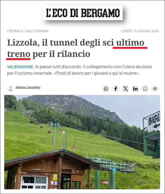 La montagna oggi muore solo se non si ha la volontà e la capacità di farla vivere: ma se si vuole ancora credere alla retorica degli “ultimi treni da non perdere” perché si rifiutano altre vie da seguire, sarebbe bene che a Colere-Lizzola (e nelle altre località con simili idee arrischiate per la testa) stiano attenti a parlare di tunnel e di treni, perché…:
