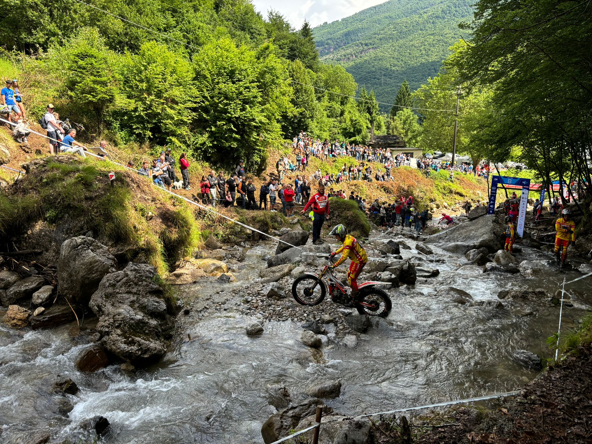 Posto ciò, ho personalmente trovato poco gradevole che uno dei campi di gara allestiti fosse dentro il torrente della Valle dei Mulini, una delle zone naturalisticamente più pregiate – e pubblicizzate – della Valsassina. Certamente c’erano tutti i permessi del caso, sicuramente il tratto interessato dalle gare era all’inizio della vallata in una zona già antropizzata, senza dubbio ci sarà stata massima attenzione al ripristino dell’area dopo la competizione. Fatto sta che vedere delle motociclette dentro l’acqua di un torrente di montagna – già nell’ambito del Parco della Grigna Settentrionale, come indicano i cartelli in loco – non è affatto bello e comunque farebbe pensare a una scarsa attenzione e sensibilità verso l’ambiente naturale locale, oltre a far temere che qualche trialista decida di emulare i campioni in gara qui o in qualche altro torrente della zona, forte della solita assenza di controlli al riguardo e del benaltrismo imperante sui temi della salvaguardia ambientale. Inutile rimarcare che i corsi d’acqua di montagna sono tra gli elementi del territorio naturale che più abbisognano di cura e tutela, come è unanimemente risaputo.