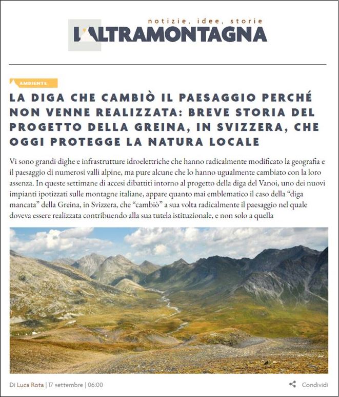 [La diga del Luzzone, alta 225 metri, una delle più grandi d’Europa. Foto di Adrian Michael, opera propria, CC BY 3.0, fonte commons.wikimedia.org.]Come riporta e ricorda il sito web del Club Alpino Svizzero, quella per il salvataggio della Greina fu una delle dispute emotivamente più forti tra quelle intraprese contro i progetti di infrastrutturazione idroelettrica del tempo. La protesta conobbe un forte sostegno su scala nazionale e, in retrospettiva, può essere considerata il precursore della resistenza a molti altri progetti previsti allora nelle valli alpine svizzere e poi cassati. La Fondazione non solo riuscì a ottenere la cancellazione del progetto e la protezione istituzionale dell’Altopiano (la Greina figura oggi nell’Inventario federale dei paesaggi, siti e monumenti naturali, che le assicura una tutela duratura e ineludibile) ma anche ad acquisire per i comuni di Vrin e Sumvitg, sottostanti alla Greina sul versante grigionese, il diritto a pagamenti annuali da parte della Confederazione in compensazione dei mancati introiti delle infrastrutture non più realizzate, pari a 1 Franco (poco più di 1 Euro) per chilowatt di produzione lorda. Queste compensazioni, poi comunemente denominate «Centesimo per il paesaggio», sono state sancite tramite legge federale nel 1995 e vengono regolarmente pagate dall’anno successivo: oggi vengono applicate anche in altri casi simili, così che comuni finanziariamente deboli possono ottenere tale forma di sostegno quando rinuncino agli introiti derivanti dall’eventuale costruzioni di impianti idroelettrici e preservino la Natura e l’ambiente dei loro territori.