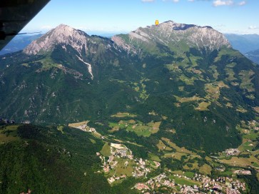 Previous ImageNext Image 309-Comprensorio_2012_5377-2 Foto aerea delle Grigne; la freccia gialla indica il posizionamento del nuovo ripetitore. sulla cresta sommitale.