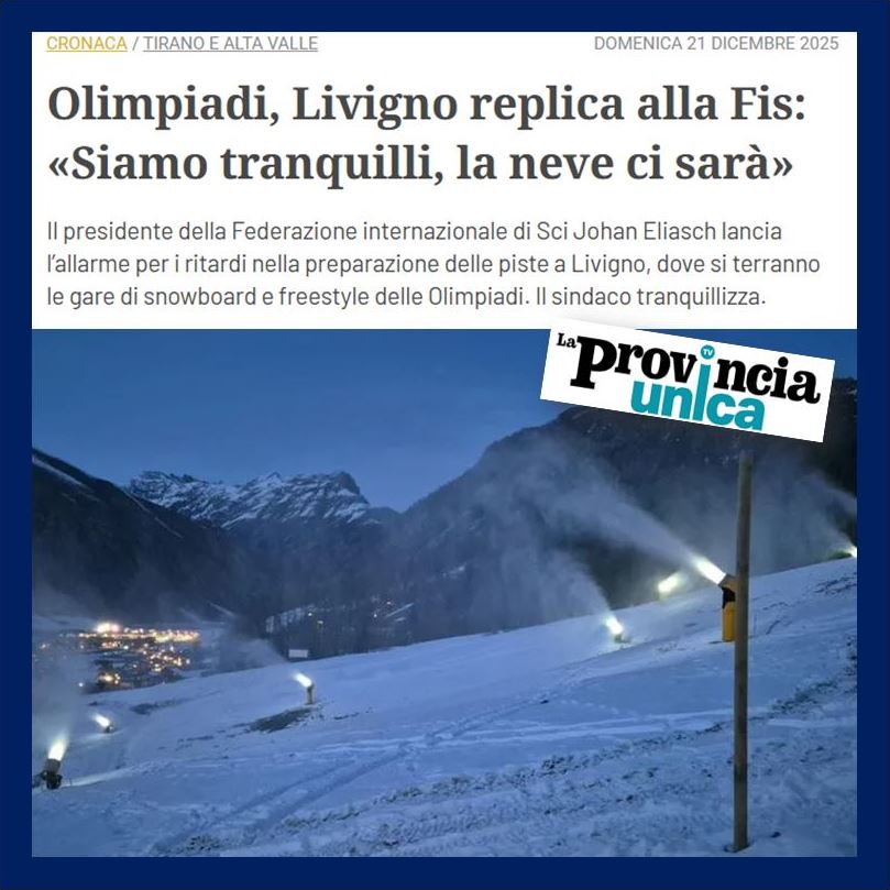 Da una parte c’è il presidente della FIS che si lamenta della mancanza di neve come se desse per scontato qualcosa che sulle Alpi non lo è più, nemmeno nella elevata e “fredda” Livigno, cioè che nevichi abbondantemente a dicembre o vi siano temperature già parecchio fredde come succedeva un tempo. Dall’altra parte, tralasciando la pantomima del sottosegretario inviato dal Ministro delle Infrastrutture in carica che rassicura tutto e tutti, chissà su che basi logiche, c’è il sindaco di Livigno il quale afferma che «Noi siamo tranquilli. I cannoni stanno sparando e non ci saranno problemi. A gennaio poi la temperatura scenderà a -20», come se anch’egli desse per scontato circostanze che purtroppo non possono più essere considerate tali, anche in quello che una volta veniva definito “il piccolo Tibet”.