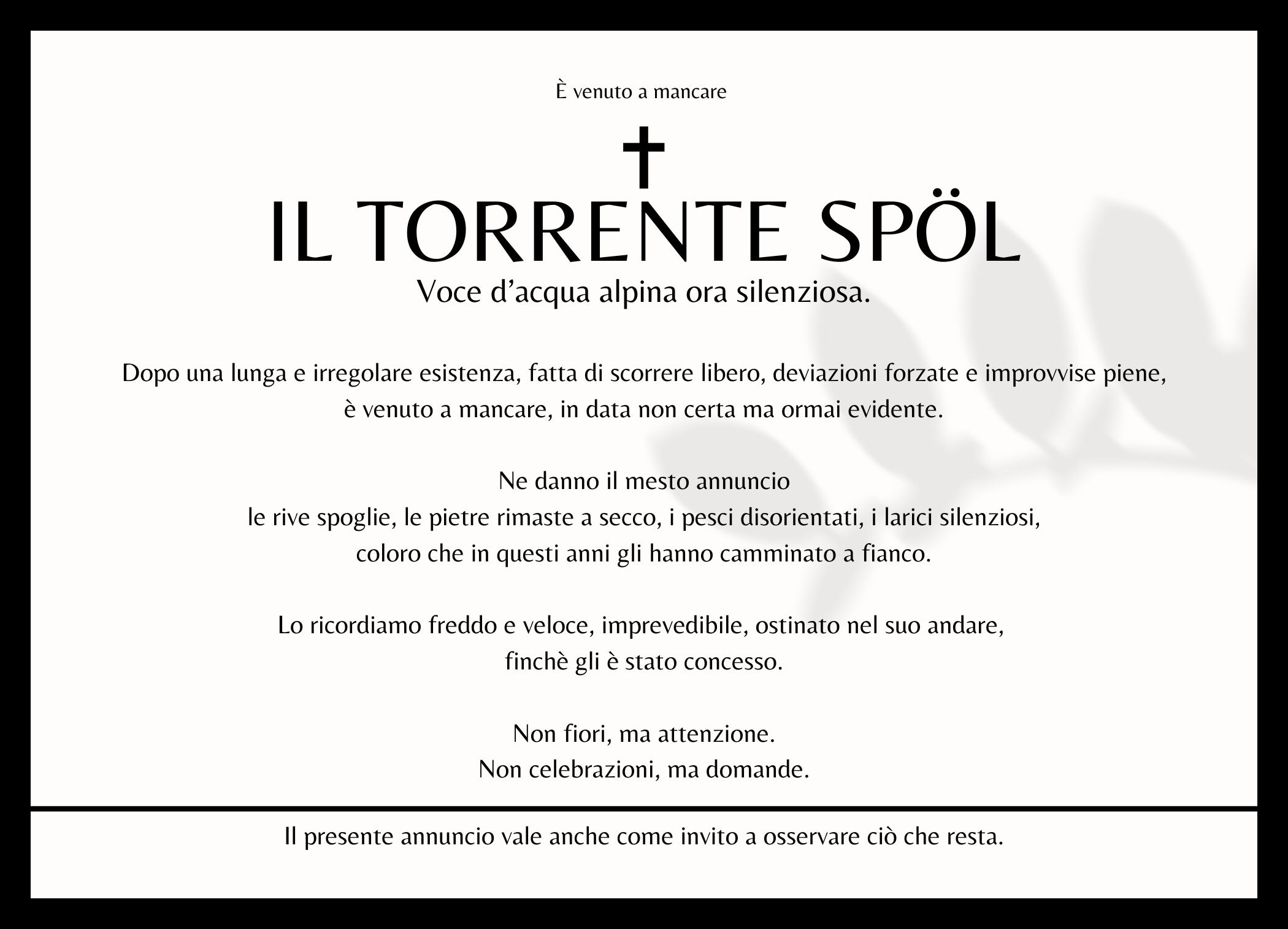 Nei giorni scorsi, a seguito delle notizie e delle polemiche sulla carenza di neve artificiale (oltre di quella naturale) sulle piste da sci di Livigno in vista delle gare di Coppa del Mondo e delle Olimpiadi di Milano Cortina, è circolato sui social, soprattutto a opera di Federico Galli dell’Associazione Pesca Livigno, il suggestivo e emblematico manifesto funebre per il torrente Spöl, o Aqua Granda, che percorre interamente la valle livignasca prima di sfociare nel lago artificiale del Gallo le cui acque, oltre l’omonima diga, defluiscono verso la Svizzera. Galli ha aggiunto al manifesto funebre – è quello lì sopra, ovviamente – alcune immagini fotografiche altrettanto significative dello stato in cui versa l’Aqua Granda, commentandole così:
