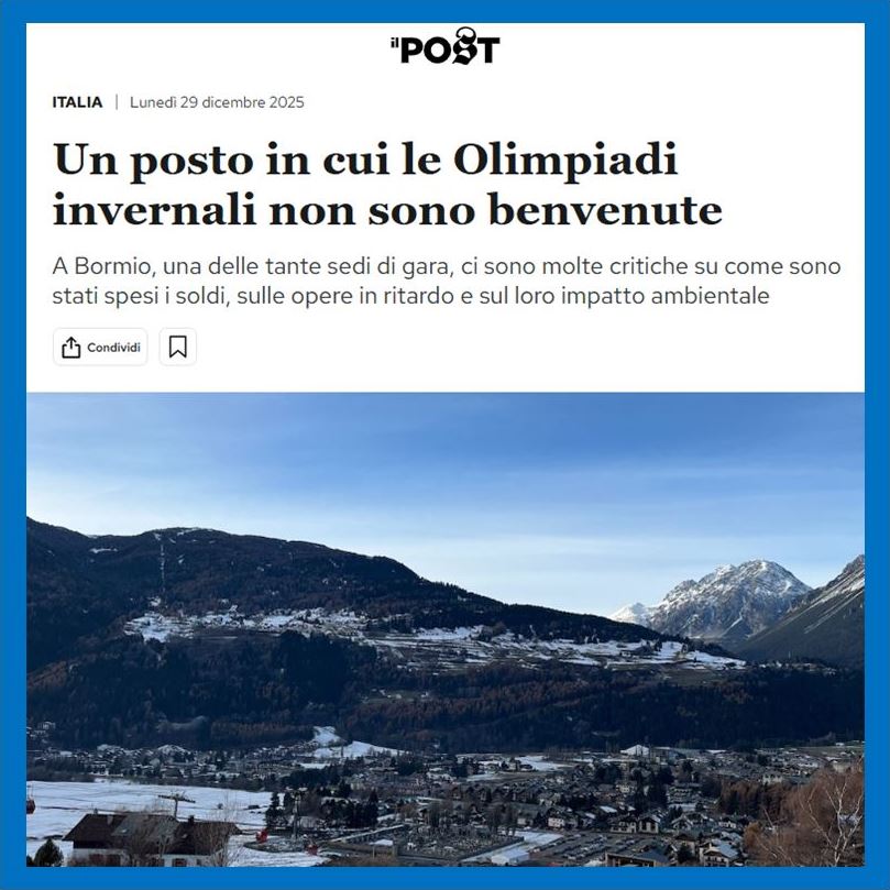Lo scorso 29 dicembre “Il Post”, con un articolo (lo vedete qui sopra) dall’eloquente titolo “Un posto in cui le Olimpiadi invernali non sono benvenute”, si è occupata di Bormio e di come la comunità locale sta vivendo i preparativi delle prossime Olimpiadi di Milano Cortina, per le quali la località valtellinese è sede di gare. “Il Post” elenca le numerose critiche emerse tra i bormini su come sono stati spesi i soldi, sulle opere in ritardo e sul loro impatto ambientale, e fa ben capire il sentore diffuso nella comunità, ampiamente negativo. Un sentore che posso confermare personalmente per testimonianza diretta, viste le volte recenti che sono stato a Bormio – in particolare, per sostenere il Comitato di tutela della Piana dell’Alute dalla ormai famosa e famigerata “Tangenzialina” che la devasterebbe – e l’attenzione costante che ho dedicato a ciò che è accaduto in loco rispetto all’organizzazione olimpica e alle relative opere.