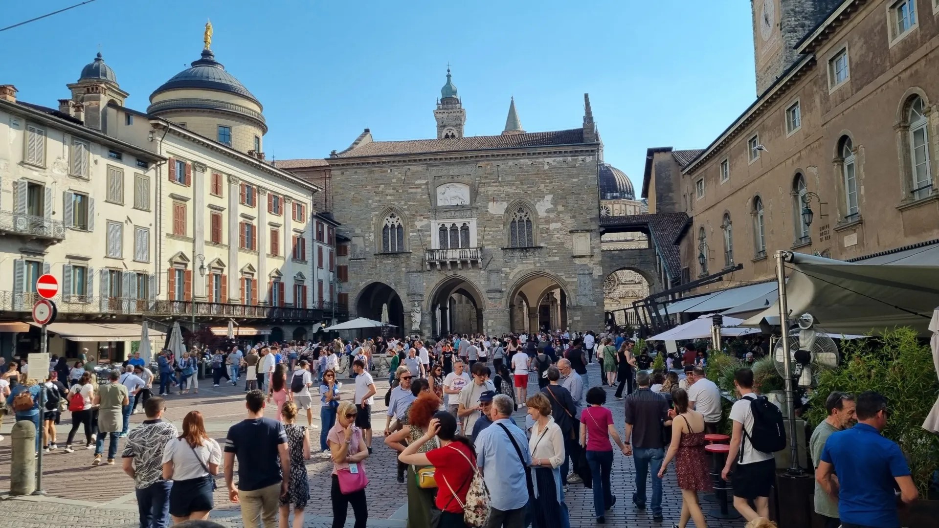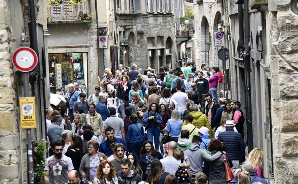 [Sovraffollamento turistico lungo la “Corsarola”, la via centrale di Bergamo Alta. Immagine tratta da https://primabergamo.it.]Insomma, Bergamo – presa da me qui come esempio rappresentativo e emblematico, nonché per la mia vicinanza geografica che me lo fa conoscere bene – sta registrando le consuete dinamiche generate dalla pressione crescente del turismo massificato contemporaneo sugli spazi abitati, sia cittadini che rurali come ad esempio le località e i territori di montagna, ove si spinga costantemente sull’acceleratore turistico per alimentarne l’economia, considerata (con parecchia retorica) sempre più importante se non «irrinunciabile», senza di contro promuovere un’adeguata regolamentazione del comparto turistico locale grazie alla quale mantenere il giusto equilibrio tra il godimento ludico-ricreativo dei luoghi da parte dei visitatori e il benessere residenziale di chi li vive. Con l’inevitabile conseguenza che i secondi subiscono svantaggi e danni via via crescenti che poi si ribaltano sulla vivibilità dei luoghi stessi, siano grandi città oppure piccoli centri, i quali in pratica si trasformano in meri divertimentifici ad uso turistico, per la gran parte gestiti da imprese private invece che dalla politica locale, sempre meno abitati e urbanamente vivi.