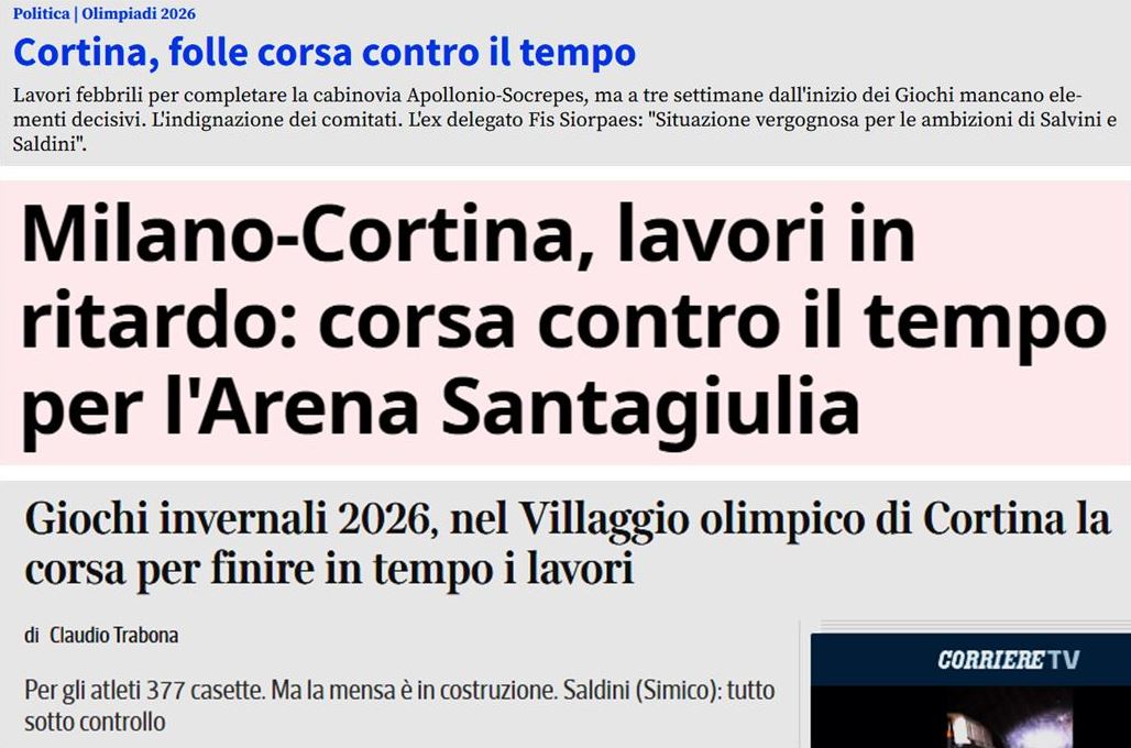 Manca sempre meno all’inizio delle Olimpiadi di Milano Cortina e sulla stampa la definizione più usata al riguardo è «corsa contro il tempo», un linguaggio più da gare di atletica che di sci! Tuttavia obiettivo, visto che quasi tutte le opere, anche quelle destinate a ospitare le gare, sono in ritardo. E lo sono non per gli imprevisti di un normale processo di realizzazione ma per la superficialità, l’incompetenza, il dilettantismo di chi sta organizzando i Giochi. Non solo: c’è anche la corsa contro i debiti, perché molte opere hanno sforato i budget di spesa e abbisognano di ulteriori soldi per coprire i costi. Chi li metterà questi soldi, secondo voi?