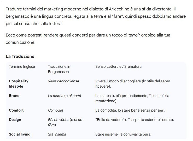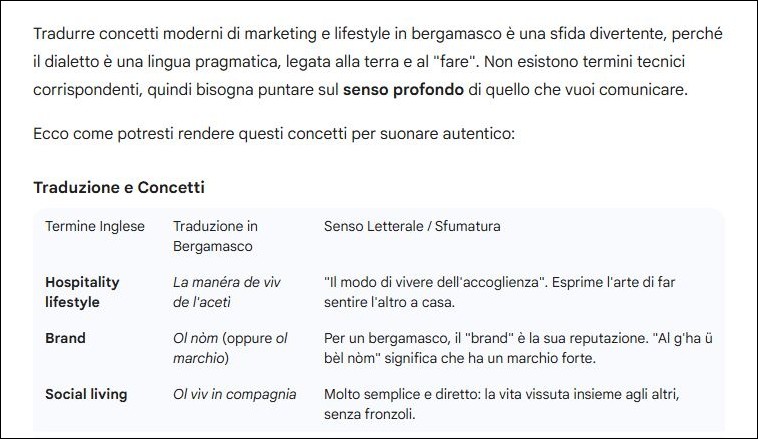 Posto tutto quanto avete letto fin qui, ho deciso di fare una cosa: ho affidato all’IA la traduzione di quegli anglicismi, suggestivi ma del tutto avulsi al territorio montano e alla realtà culturale, nel dialetto bergamasco. Ecco la risposta che l’IA ha elaborato e mi ha proposto: