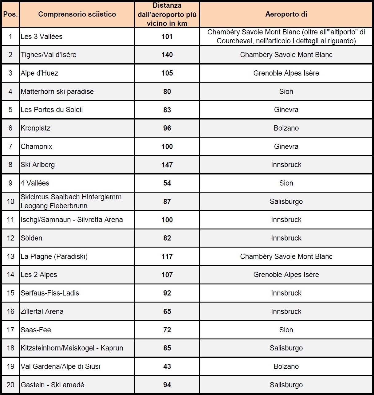 Cito altre tre località alpine molto rinomate e glamour, dato che non sono riportare nella graduatoria sopra pubblicata, giusto per dare un quadro ancora più completo della situazione: Davos, in Svizzera, aeroporto più vicino Samedan (Engadin Airport) a 87 km; Gstaad, sempre in Svizzera, aeroporto più vicino Berna a 81 km; Kitzbuhel, in Austria, aeroporto più vicino Salisburgo, 73 km.