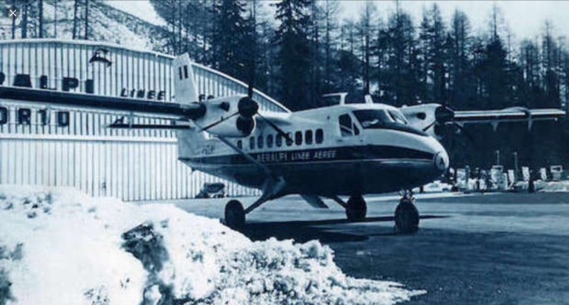 [Un velivolo della Aeralpi sul piazzale dell’aeroporto di Cortina-Fiames negli anni Sessanta. Immagine tratta da www.facebook.com/aviazionecivile.it.]