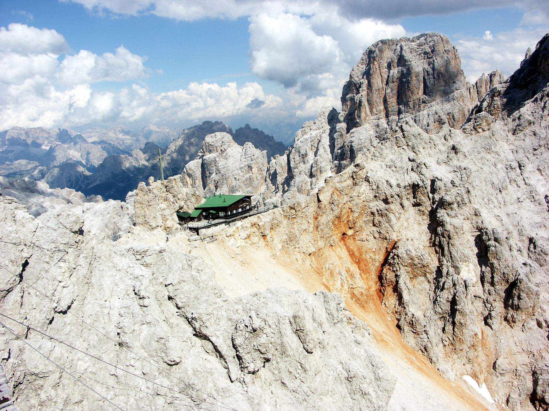 [Qui sopra, il Rifugio Rosalba sulla Grigna Meridionale; sotto, il Rifugio Lorenzi (chiuso da tempo) sul Monte Cristallo. Le due vedute fanno capire bene la similitudine geomorfologica e paesaggistica tra le due montagne, con la sola variante del manto erboso verde intorno al Rifugio Rosalba dovuto alla quota più bassa. Foto sopra tratta da https://lemontagne.net, foto sotto di Rüdiger – selbst fotografiert Ruedi, CC BY-SA 3.0, fonte commons.wikimedia.org.]