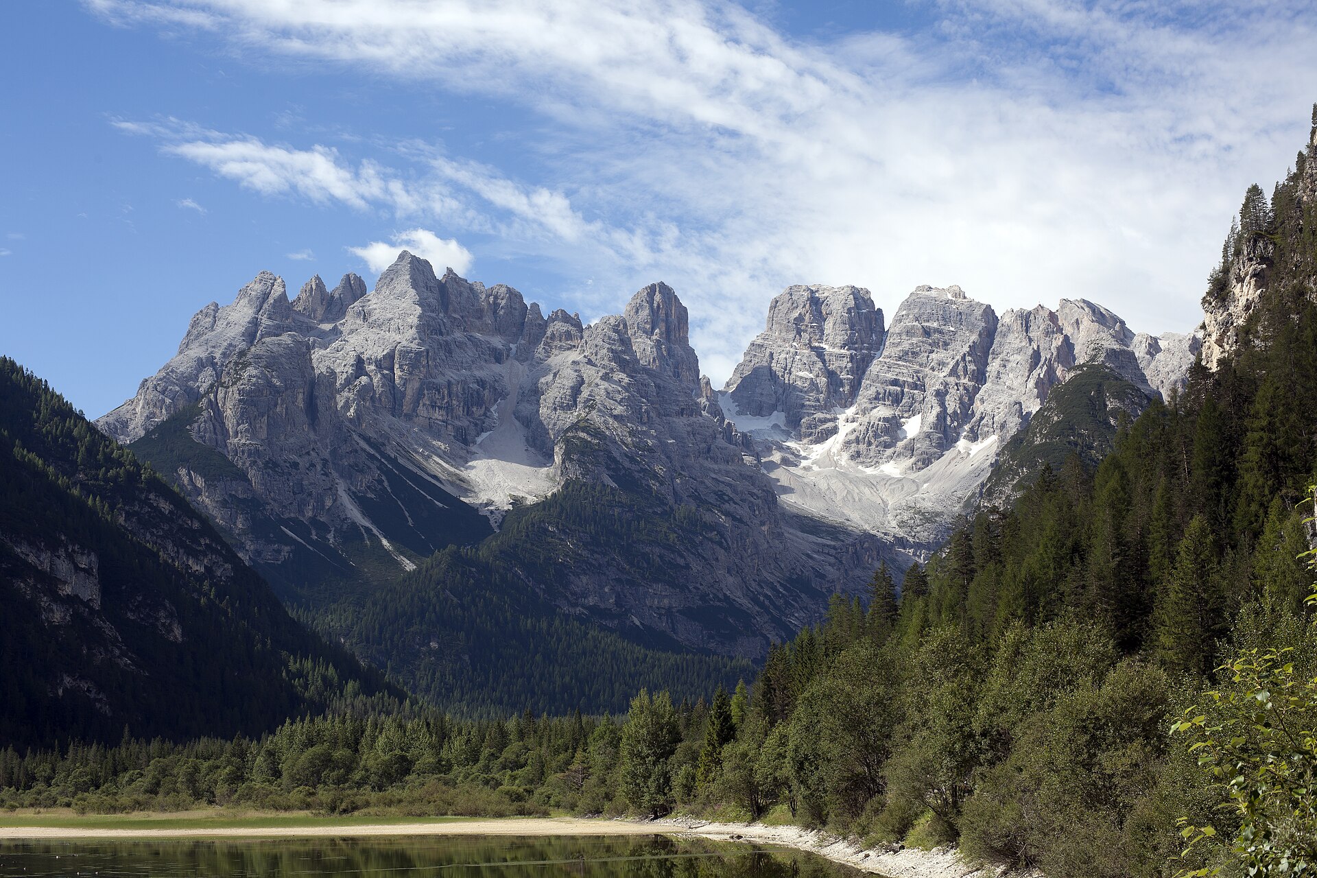 [Il Monte Cristallo visto dalle rive del Lago di Landro. Foto di Metallaro1980, dominio pubblico, fonte commons.wikimedia.org.]
