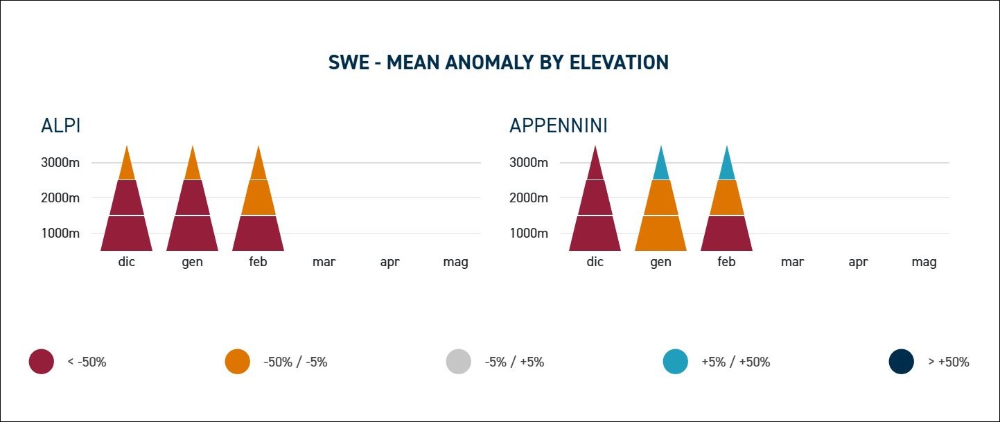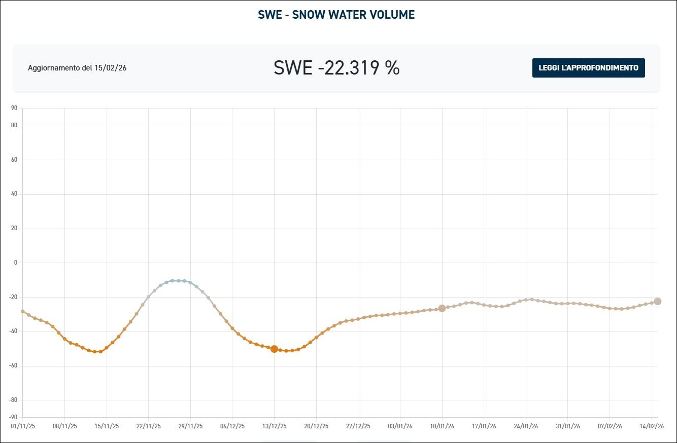 In ogni caso la migliore fotografia della neve sulle montagne italiane la fornisce al solito la prestigiosa Fondazione Cima, che da tempo porta avanti il monitoraggio costante dei dati d’innevamento sui monti italiani anche al fine di poter stimare le risorse idriche che saranno disponibili nei mesi primaverili ed estivi. Il dato fondamentale al riguardo è lo Snow Water Equivalent (SWE), o “equivalente idrico nivale”, una misura che rappresenta la quantità di acqua derivabile dalla neve qualora venisse completamente fusa. Si calcola moltiplicando lo spessore del manto nevoso per la sua densità e si esprime in millimetri d’acqua equivalente, oppure in kg/m2.