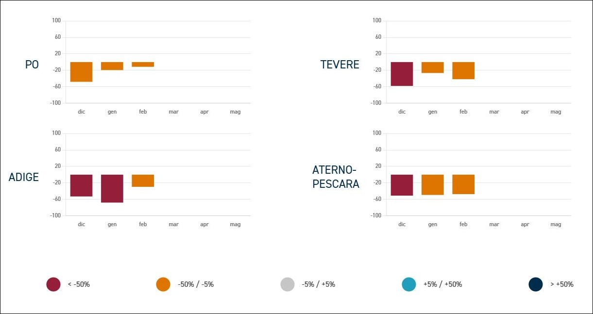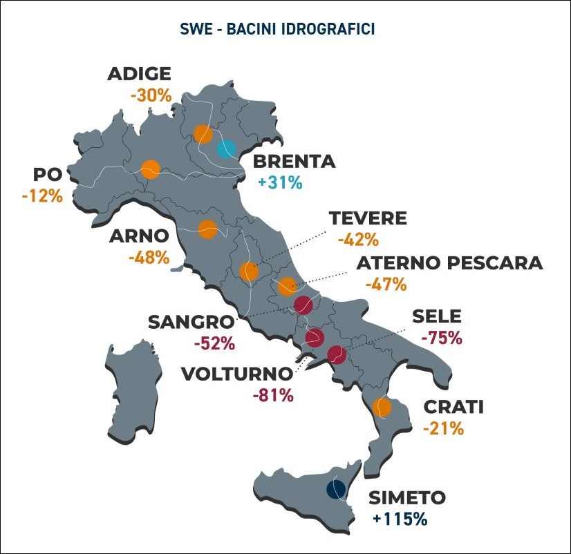 I bacini idrografici, che raccolgono le acque di fusione della neve sulle montagne, sono tutti in deficit eccetto quello del Brenta in Veneto e del Simeto in Sicilia: