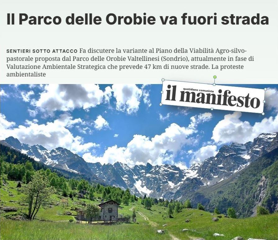 Su “ExtraTerrestre”, l’inserto ecologista de “Il Manifesto” che esce in edicola ogni giovedì, Serena Tarabini presenta una dettagliata analisi della variante al Piano della Viabilità Agro-silvo-pastorale proposta dal Parco delle Orobie Valtellinesi (in provincia di Sondrio), attualmente in fase di Valutazione Ambientale Strategica, che prevede 47 km di nuove strade definite al servizio di «attività del settore primario, quindi agricoltura e silvicoltura» ma che risulta evidente abbiano un “secondo” fine turistico – o per meglio dire elettrocicloescursionistico – oltre che un’utilità assai funzionale al sollazzo sgasante dei soliti motociclisti fuorilegge. Il tutto, ribadisco, in un’area di tutela naturale e ambientale qual è il Parco delle Orobie Valtellinesi (!) nei confini si trovano già quasi 450 chilometri di strade (!!). Scusate, ma… “area di tutela” dove?
