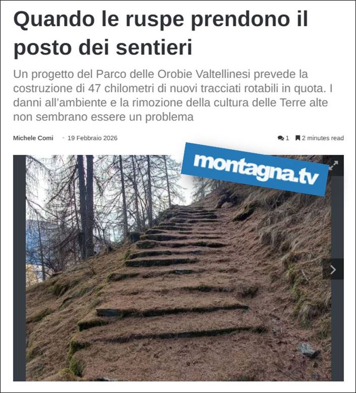 A mia volta segnalo l’articolo al solito illuminante dell’amico e stimata guida alpina della Valmalenco Michele Comi che su “Montagna.tv” riflette su quando le ruspe prendono il posto dei sentieri e i danni all’ambiente e la rimozione della cultura delle Terre alte non sembrano essere un problema. Sì, perché la variante VASP del Parco delle Orobie valtellinesi ammetterebbe la distruzione dei percorsi locali originali, incluse mulattiere selciate e sentieri secolari, qualora la conservazione in situ non fosse ritenuta “fattibile”: un vero e proprio crimine, dal mio punto di vista. Scrive Michele: