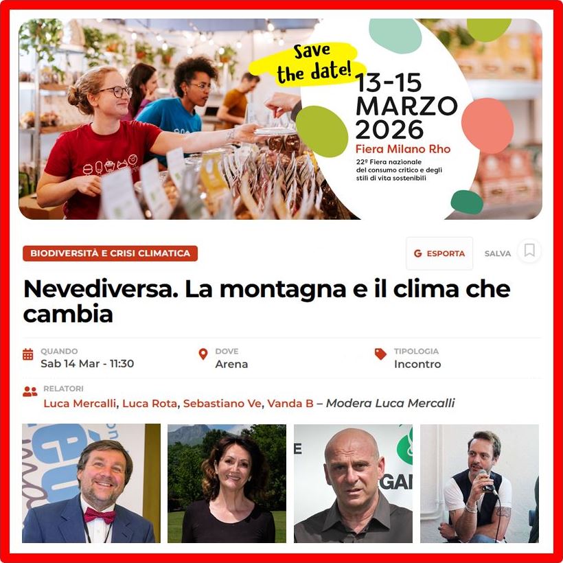 Vi rammento che domani (oggi se leggete di sabato) 14 marzo, alle 11.30, sarò a Milano, nell’ambito della fiera “Fa’ la cosa giusta”, per partecipare all’incontro Nevediversa. La montagna e il clima che cambia, organizzato e curato da Legambiente.